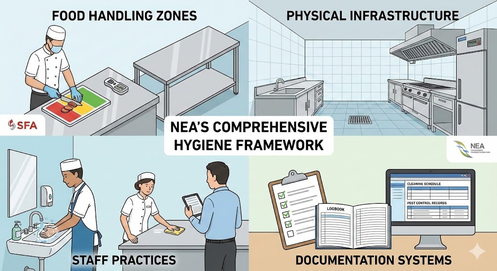 The NEA’s approach to restaurant hygiene assessment extends beyond visual inspection. Auditors evaluate your establishment through a comprehensive lens that examines both physical conditions and management systems. Working alongside the Singapore Food Agency (SFA), NEA enforces stringent standards across Singapore’s 52,000+ licensed food establishments. Understanding this framework is essential for designing protocols that address every compliance dimension.