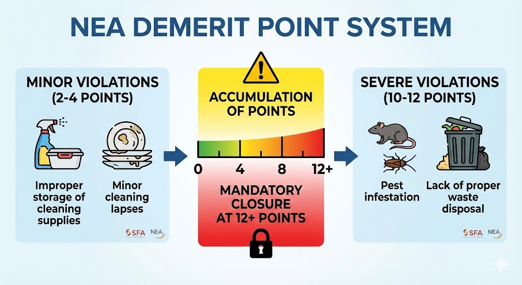 NEA operates on a demerit point framework that assigns varying weights to different violations. Minor issues like improper storage of cleaning supplies might incur 2-4 points, while severe violations such as pest infestation or lack of proper waste disposal can result in 10-12 points. Accumulating 12 or more demerit points triggers mandatory closure until issues are rectified and verified.